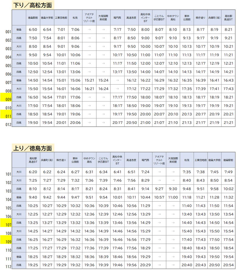 下り:徳島駅16:50発 高松行、徳島駅18:50発 高松行(四国高速バス運行)