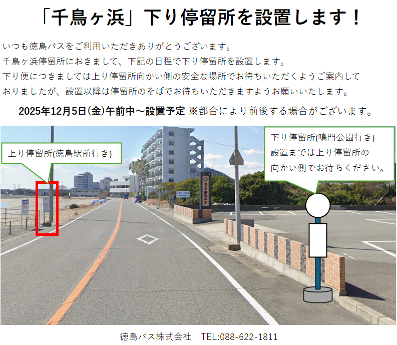 【鳴門線】千鳥ヶ浜下り停留所の設置について 2025.11.28 路線バス いつも徳島バスをご利用いただきありがとうございます。 千鳥ヶ浜停留所におきまして、下記の日程で下り停留所を設置します。 下り便につきましては上り停留所向かい側の安全な場所でお待ちいただくようご案内しておりましたが、設置以降は停留所のそばでお待ちいただきますようお願いいたします。設置予定日時2025年12月5日(金)午前中~ ※都合により前後する場合がございます。 設置のお知らせ 一覧に戻る