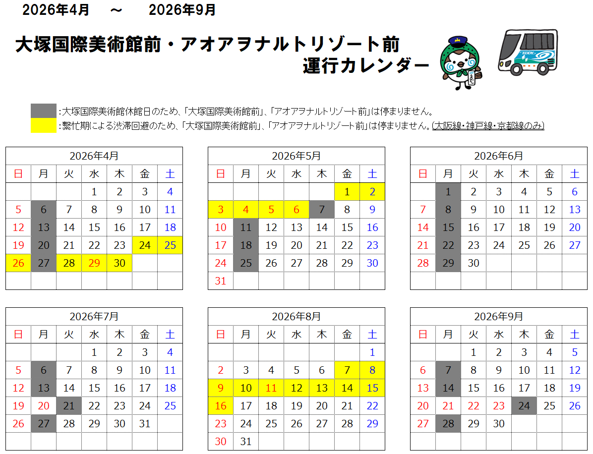 「大塚国際美術館前・アオアヲナルトリゾート前」運行日カレンダー