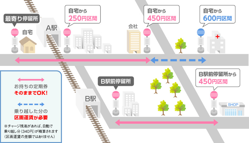 停留所を指定する「区間式定期券」から運賃額を指定する「金額式定期券」に変更となります。この「金額式定期券」は、運賃区間内であれば自由に乗り降り可能で、大変お得にご利用いただくことができます。