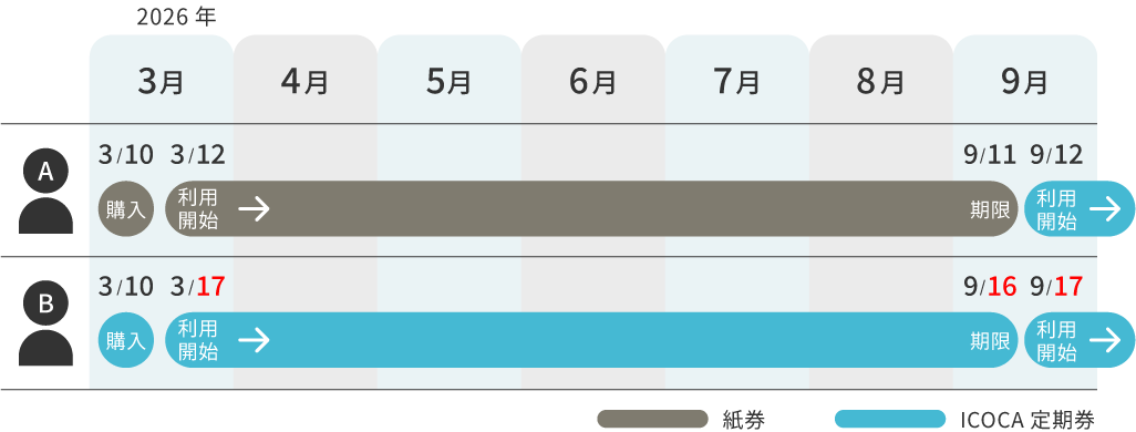 - 現在使用中の定期券と新定期券の有効期限が連続しない場合は、現在使用中定期券の有効期限終了後に改めて購入をお願いします。(日にちを空けての継続発行はできません)